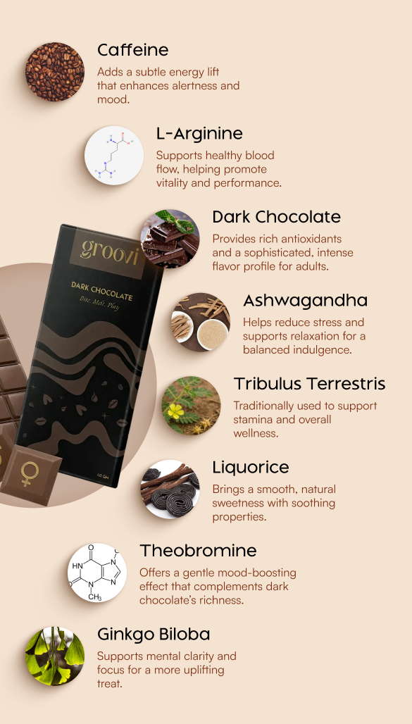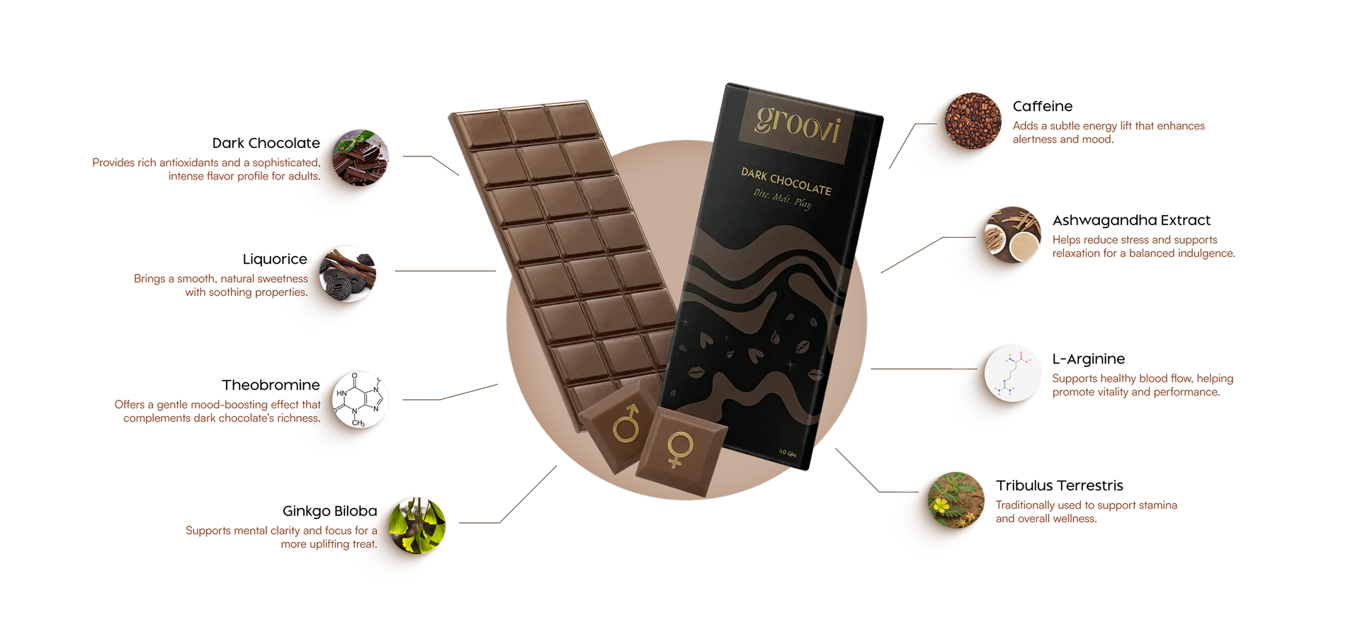 GROOVI BLENDS BOLD BITES WITH PLAYFUL PLEASURE. OUR APHRODISIAC CHOCOLATES ARE MADE TO MELT MOODS, BREAK TABOOS, AND SPARK CONNECTION.
